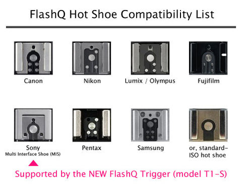 FlashQ supports remote triggering flashes at sync speeds up to 1/250 sec*. The trigger signal is barely on the central contact of standard ISO hot shoe. No TTL information is transmitted by FlashQ. This makes FlashQ compatible with most camera and Flash brands.