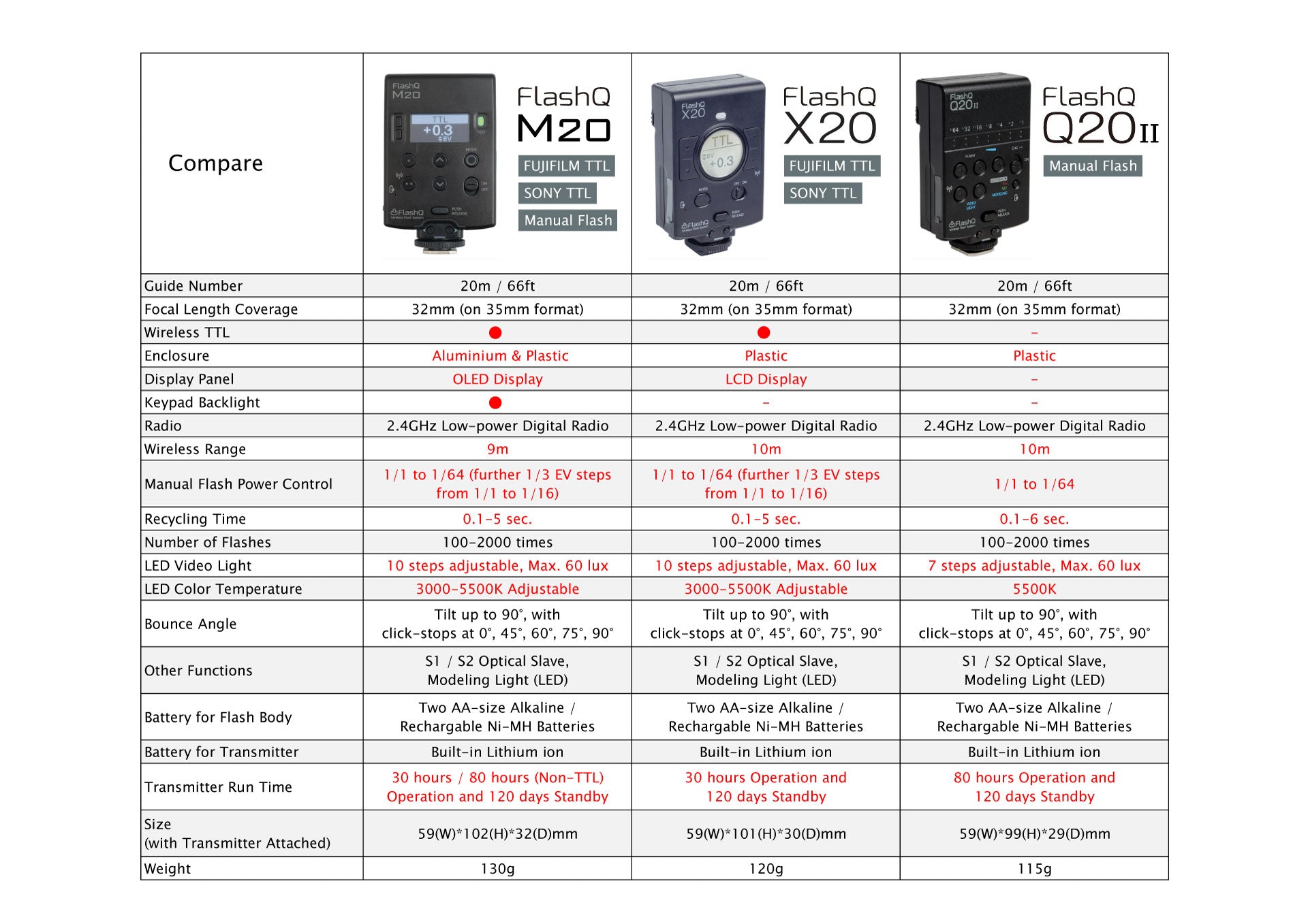 FlashQ X20 (model X20-F) supports FUJIFILM camera models: