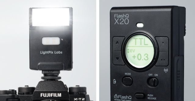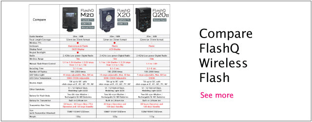 | FlashQ X20 is a powerful, feature-rich wireless flash, designed for off-camera flash photography. And it is small enough to fit in a pocket, the portability makes it a perfect match for compact mirrorless cameras. |